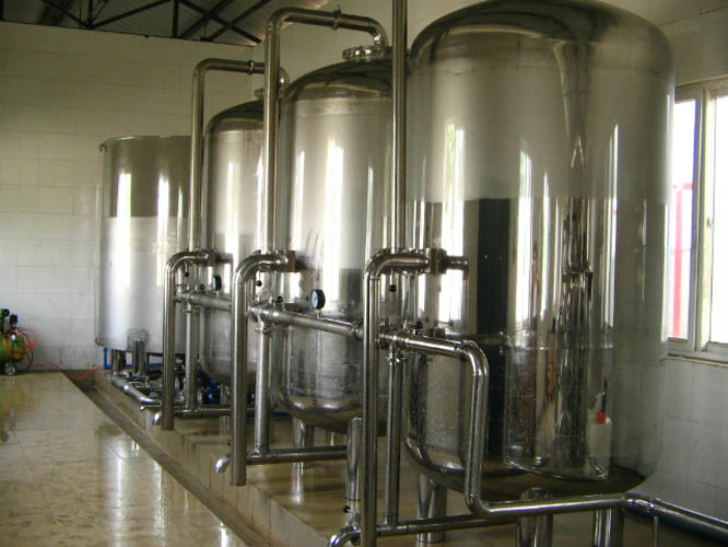 活性炭具有极强的吸附过滤性能,对水中的余氯、异色、异味、有机物等具有很强的吸附作用。由于反渗透膜对余氯、有机物十分敏感,所以必须配置活性炭吸附余氯、有机物,使出水余氯≤0.1mg/L,SDI≤4,满足反渗透膜的给水要求。可通过随时控制阀进行反洗,以冲洗掉其表面的污物,防止其堵塞,恢复其处理能力。